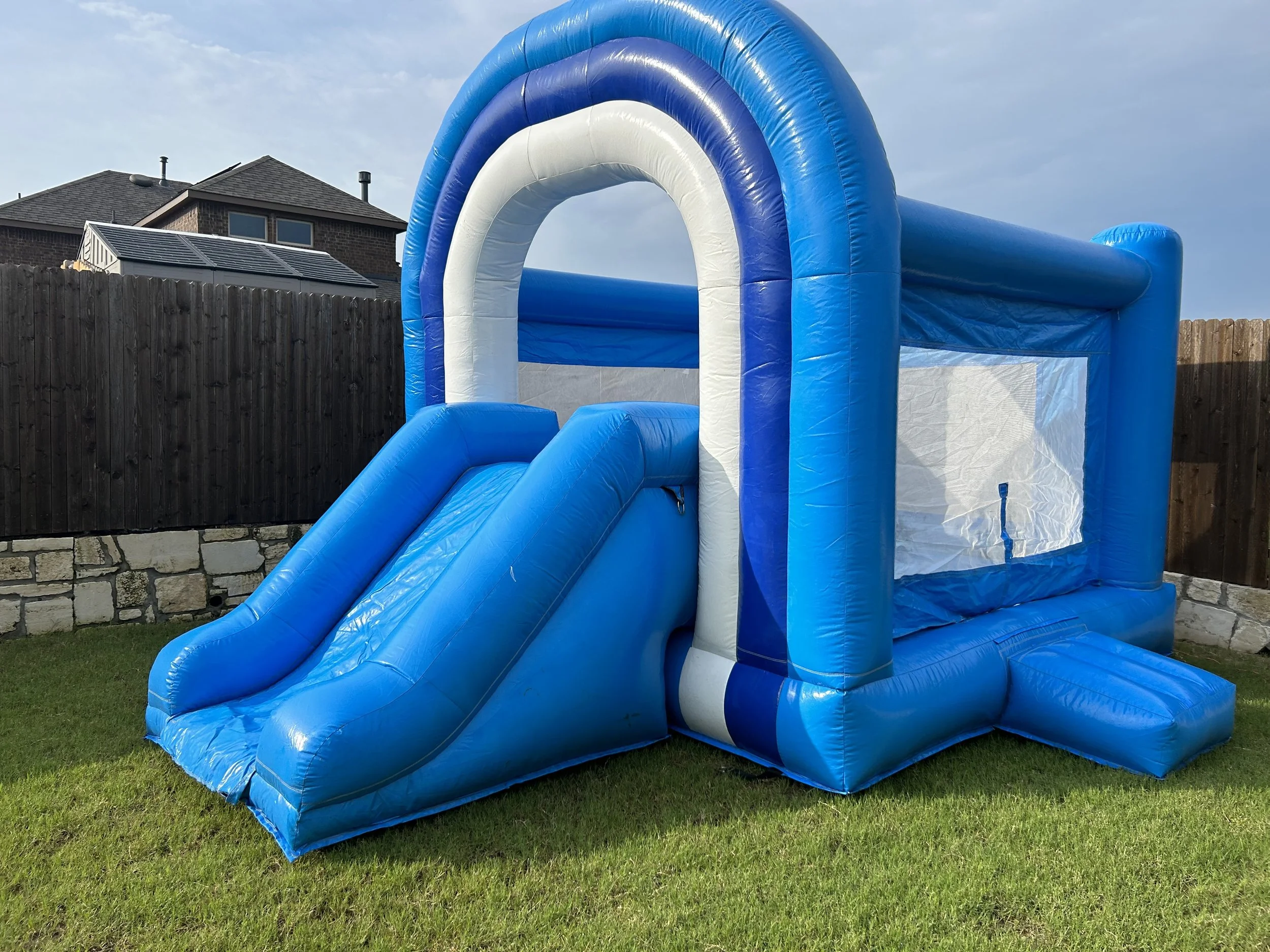 This blue bounce house features a charming arch design, a fun slide, and a lower cushion height for toddlers to climb, making it the perfect addition to any party!