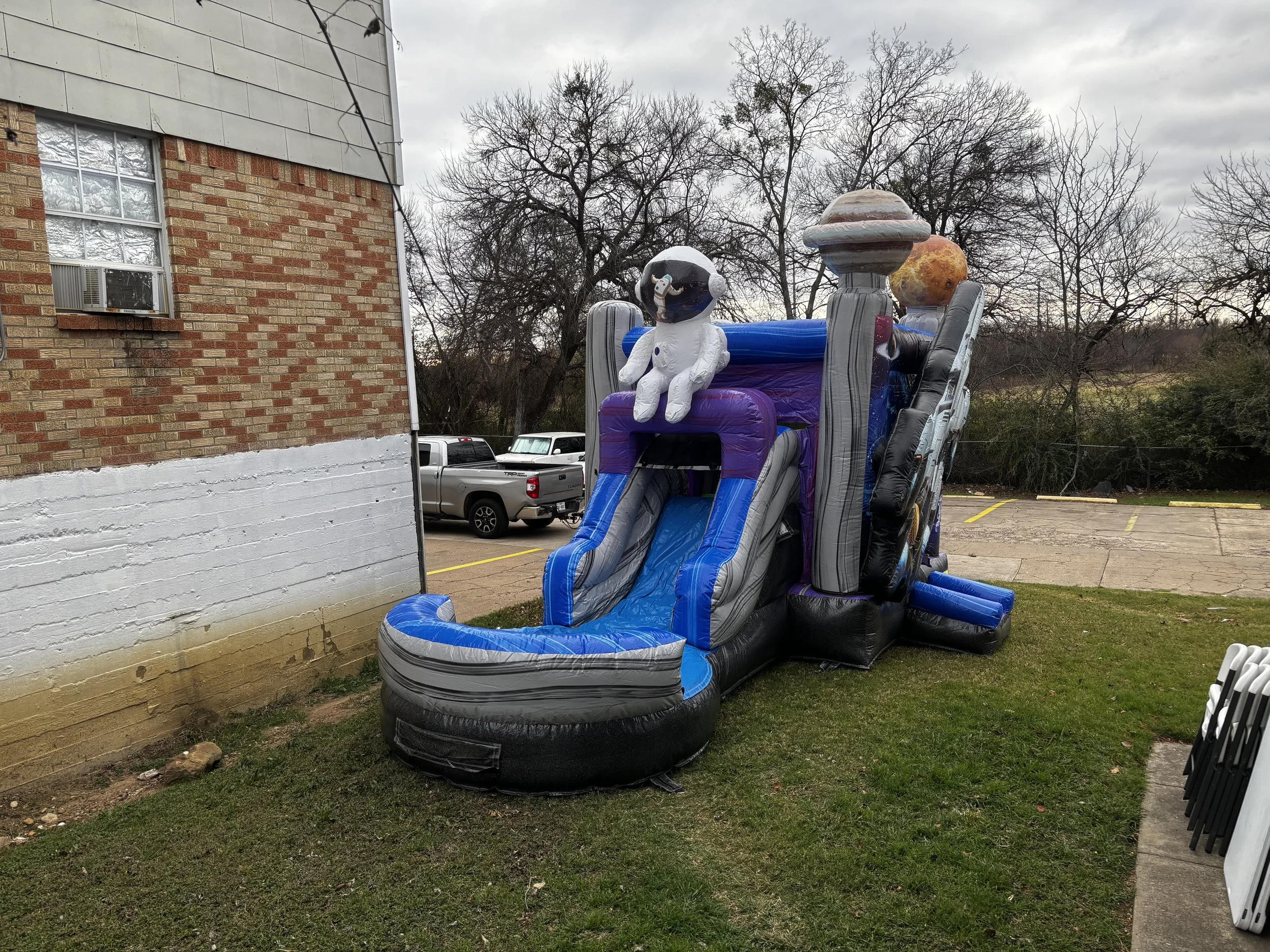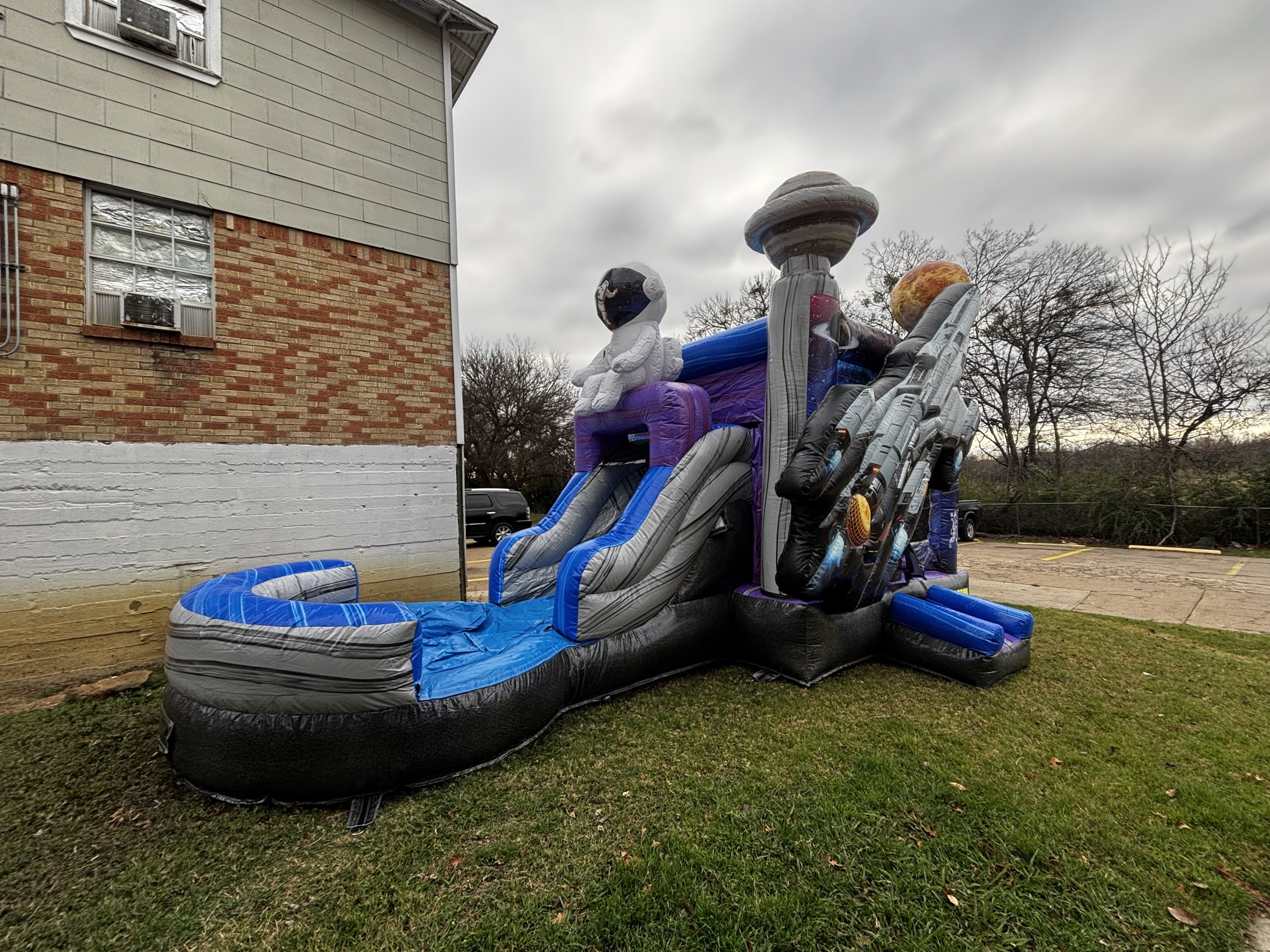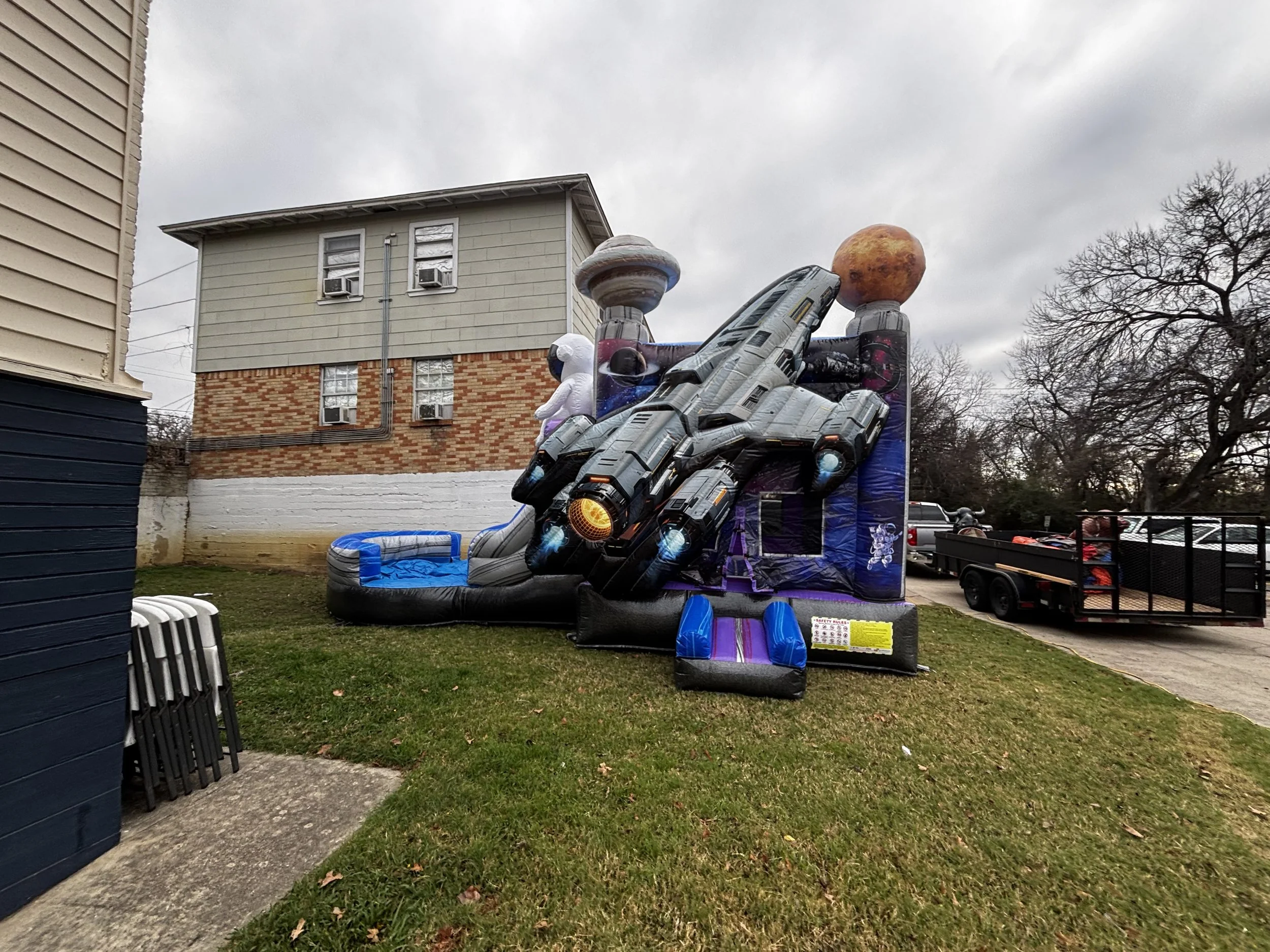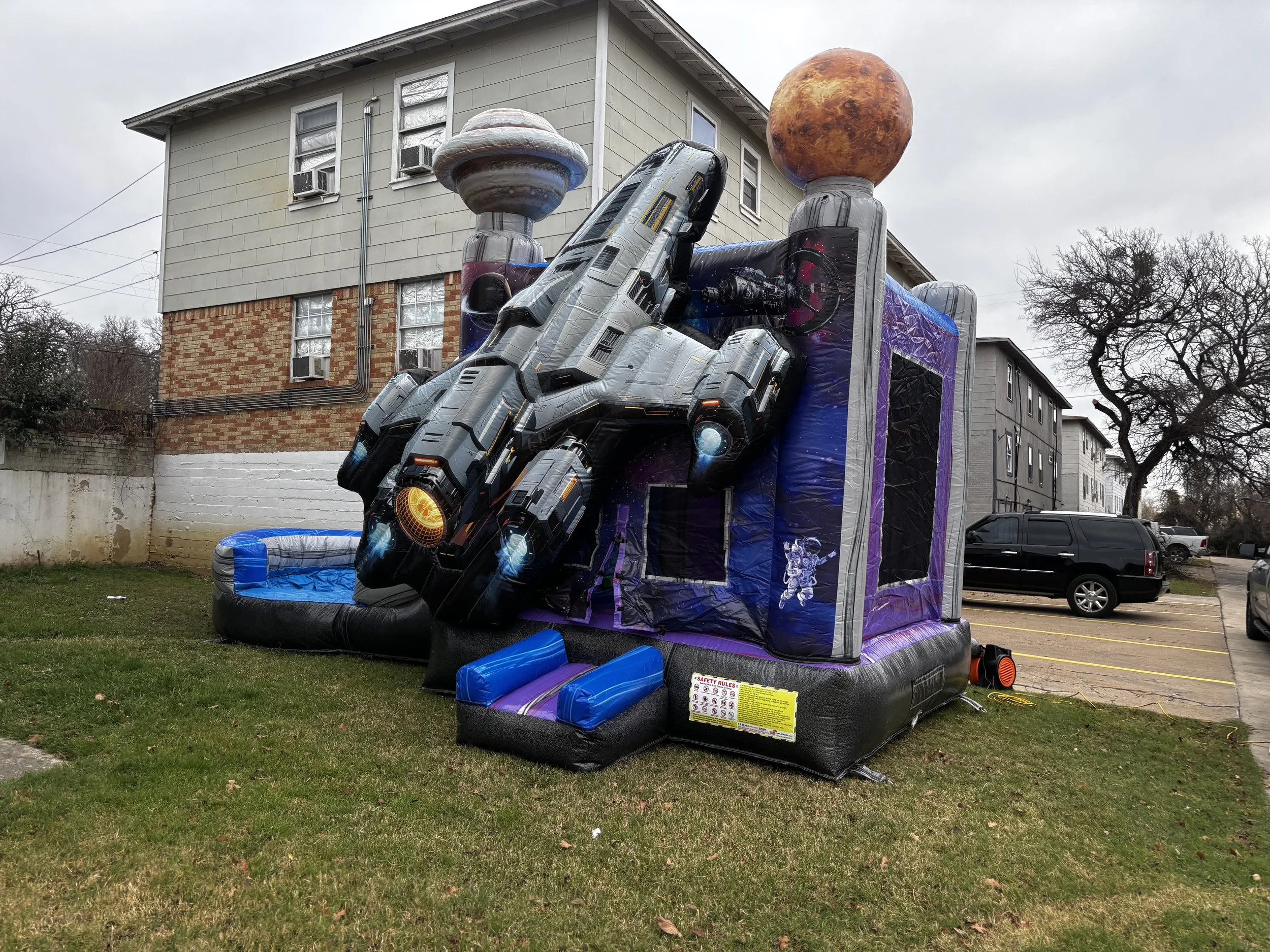 This out-of-this-world bounce house features a space design, a fun slide, a basketball hoop, and an inflatable cushion, making it an ideal choice for any party!
