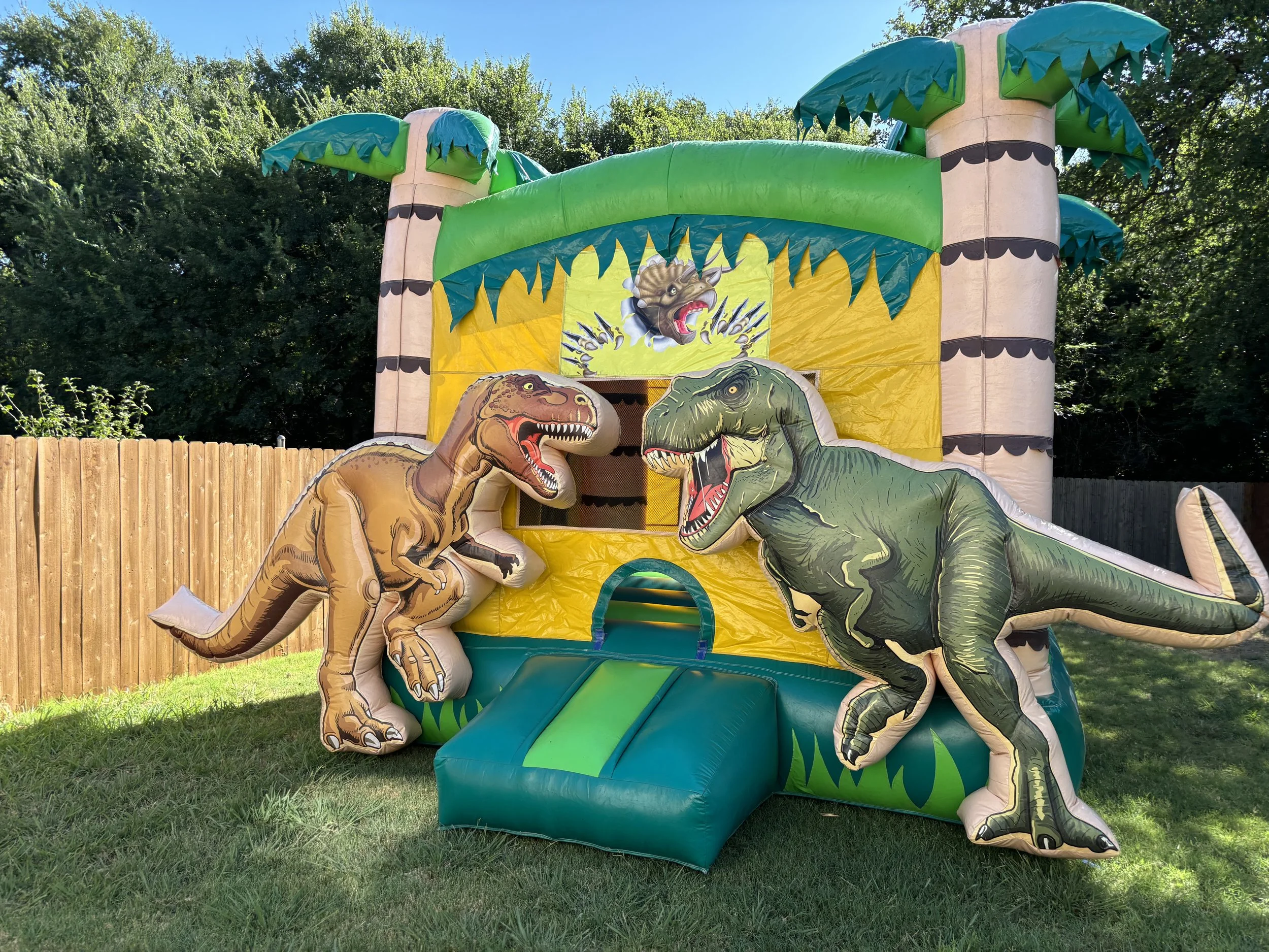 This inflatable features two large dinosaurs at the entrance, a built-in basketball hoop, and a compact size of 13x13 feet, making it perfect for most outdoor spaces.
