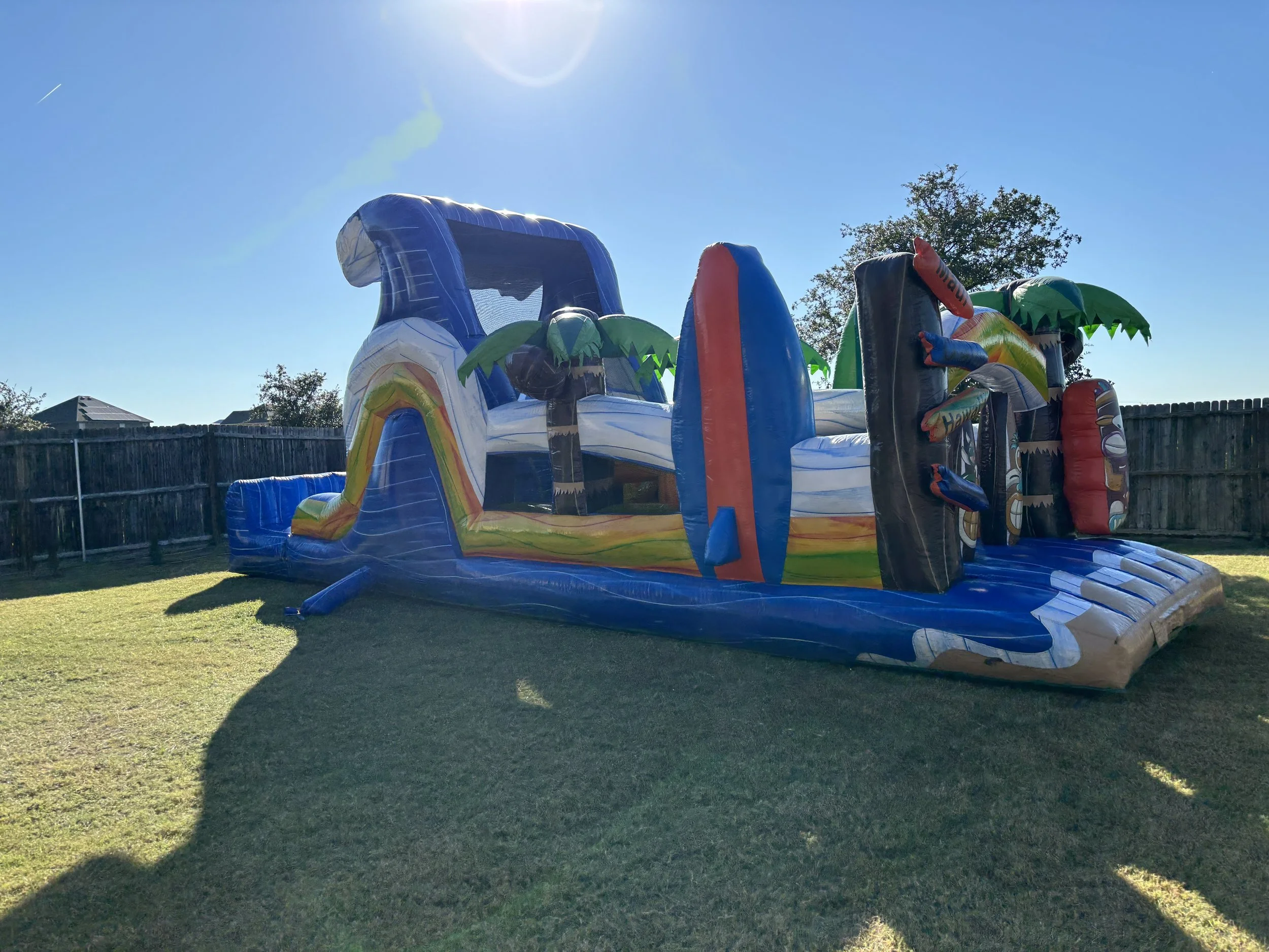 Hawaiian-themed inflatable obstacle course! Featuring a giant wave, climbing ladder, thrilling slide, and fun obstacles, this versatile attraction can be used wet or dry, ensuring endless excitement for all ages.