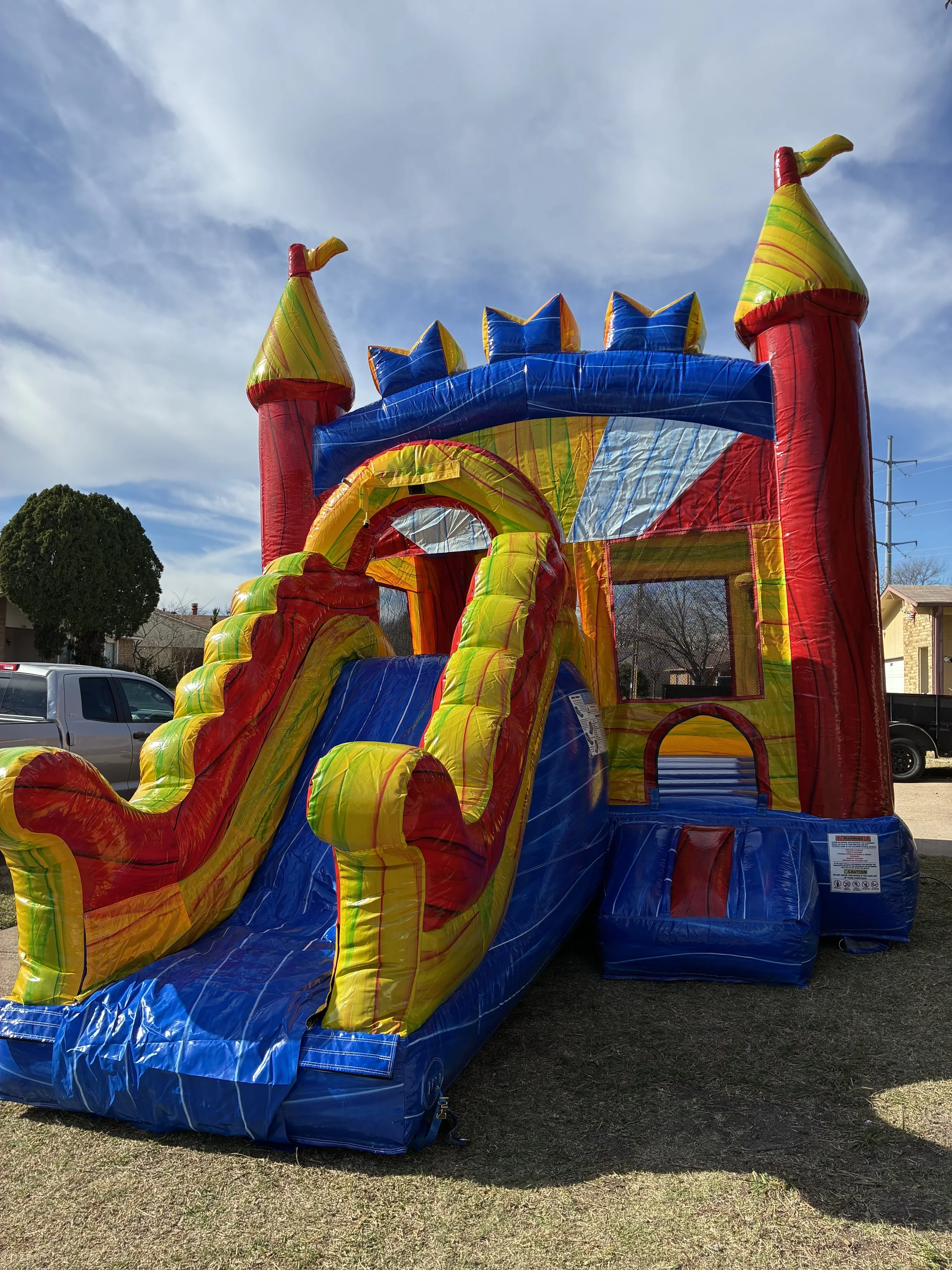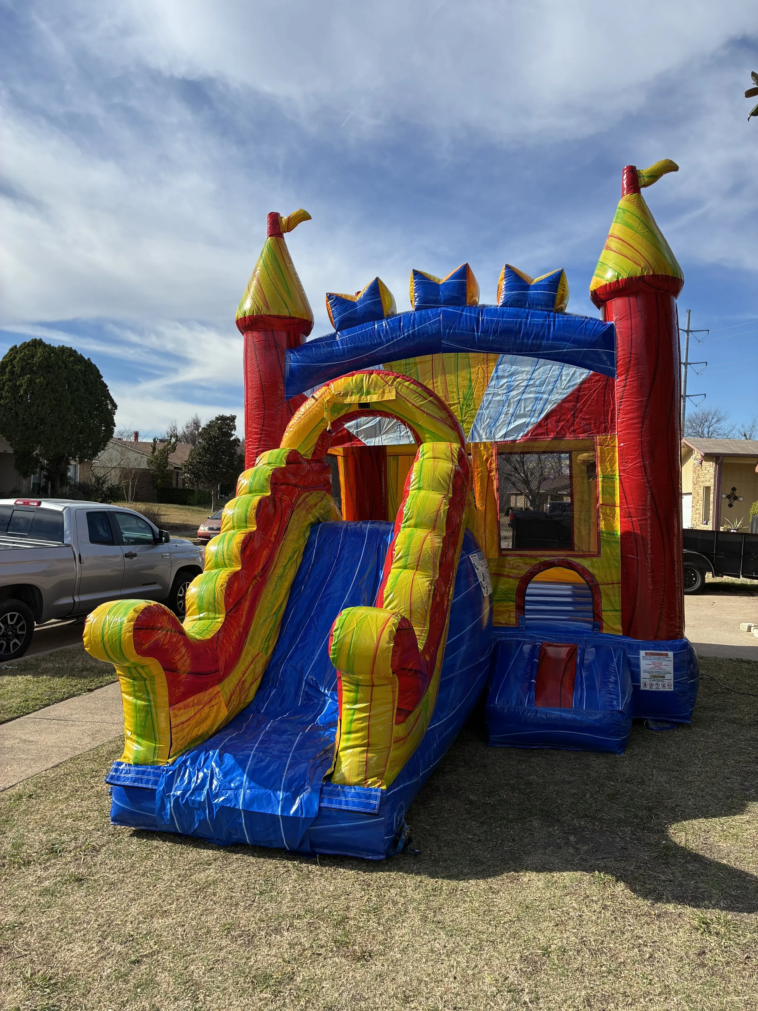 This bounce house, which features a front-facing slide, a basketball hoop, and a cheerful marble design, can be used wet or dry.