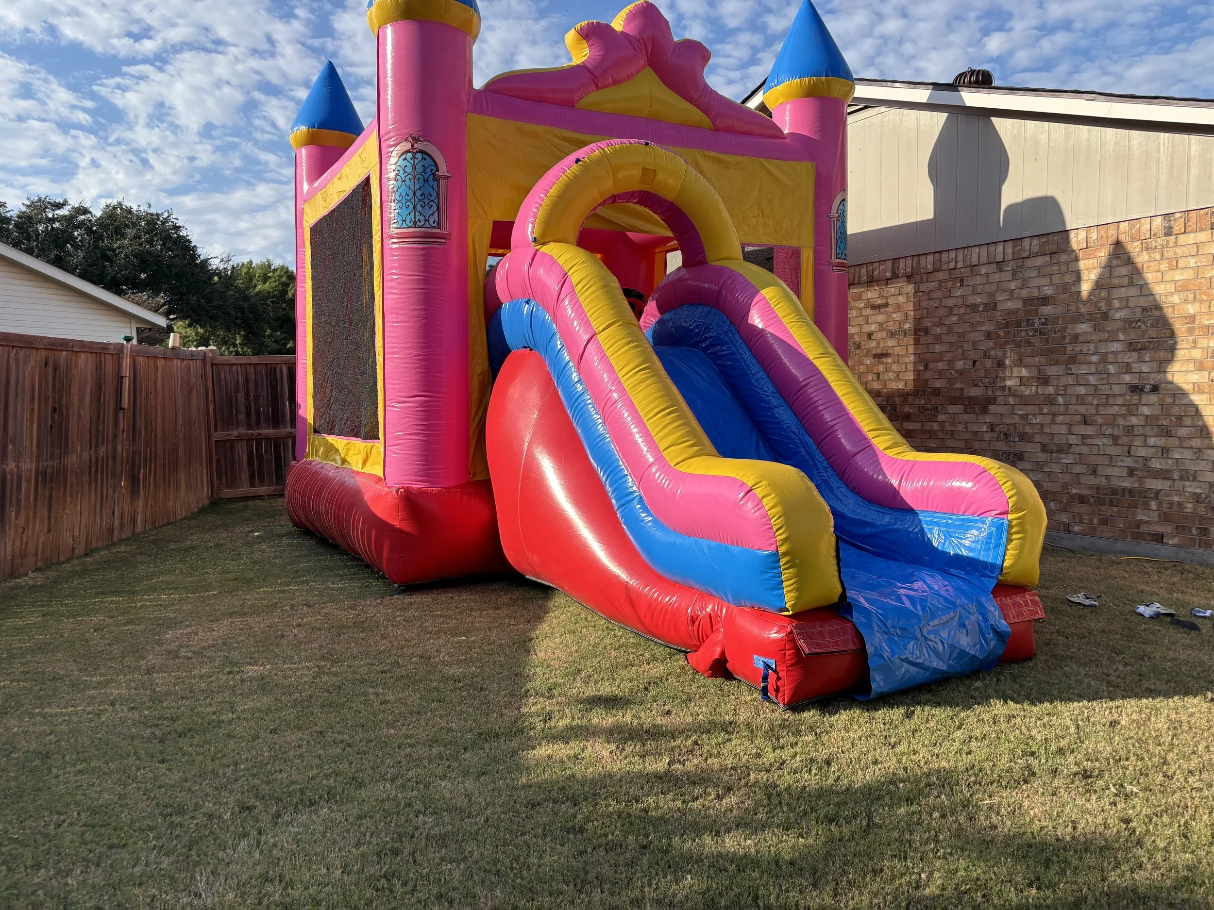 This inflatable features a pink castle design, a front slide, a basketball hoop, and water-compatible features for summer play!